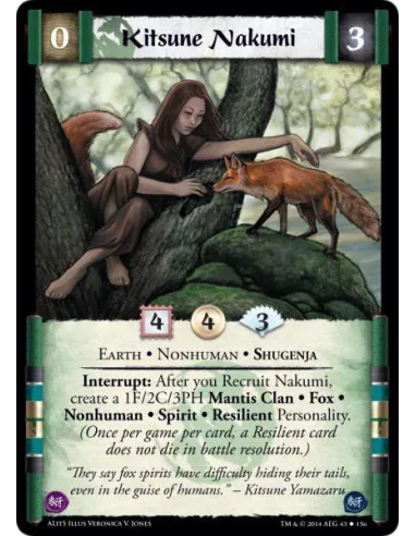 Interrupt: After you Recruit Nakumi, create a 1F/2C/3PH Mantis Clan • Fox • Nonhuman • Spirit • Resilient Personality. (Once per game per card, a Resilient card does not die in battle resolution.)