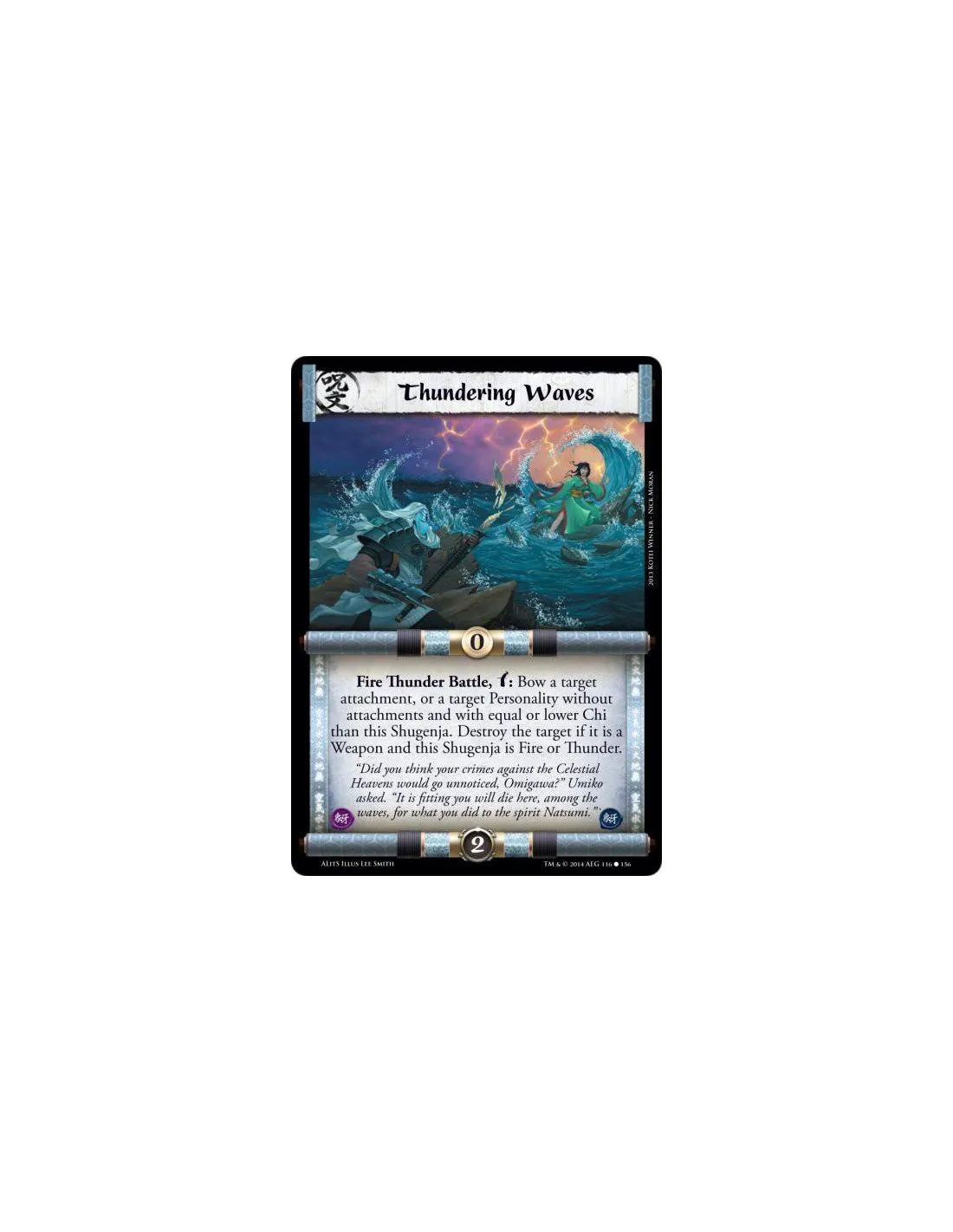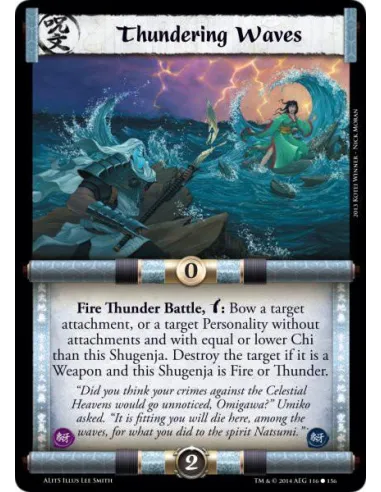 Fire Thunder Battle, w: Bow a target attachment, or a target Personality without attachments and with equal or lower Chi than this Shugenja. Destroy the target if it is a Weapon and this Shugenja is Fire or Thunder.