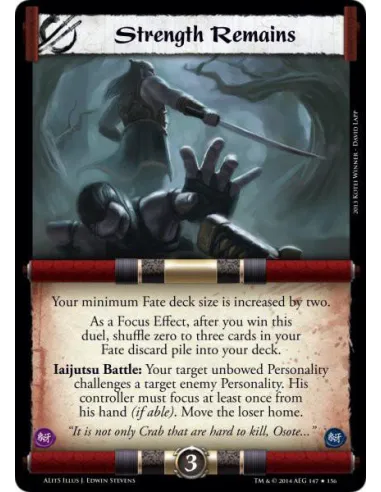 Iaijutsu Battle: Your target unbowed Personality challenges a target enemy Personality. His controller must focus at least once from his hand (if able). Move the loser home.