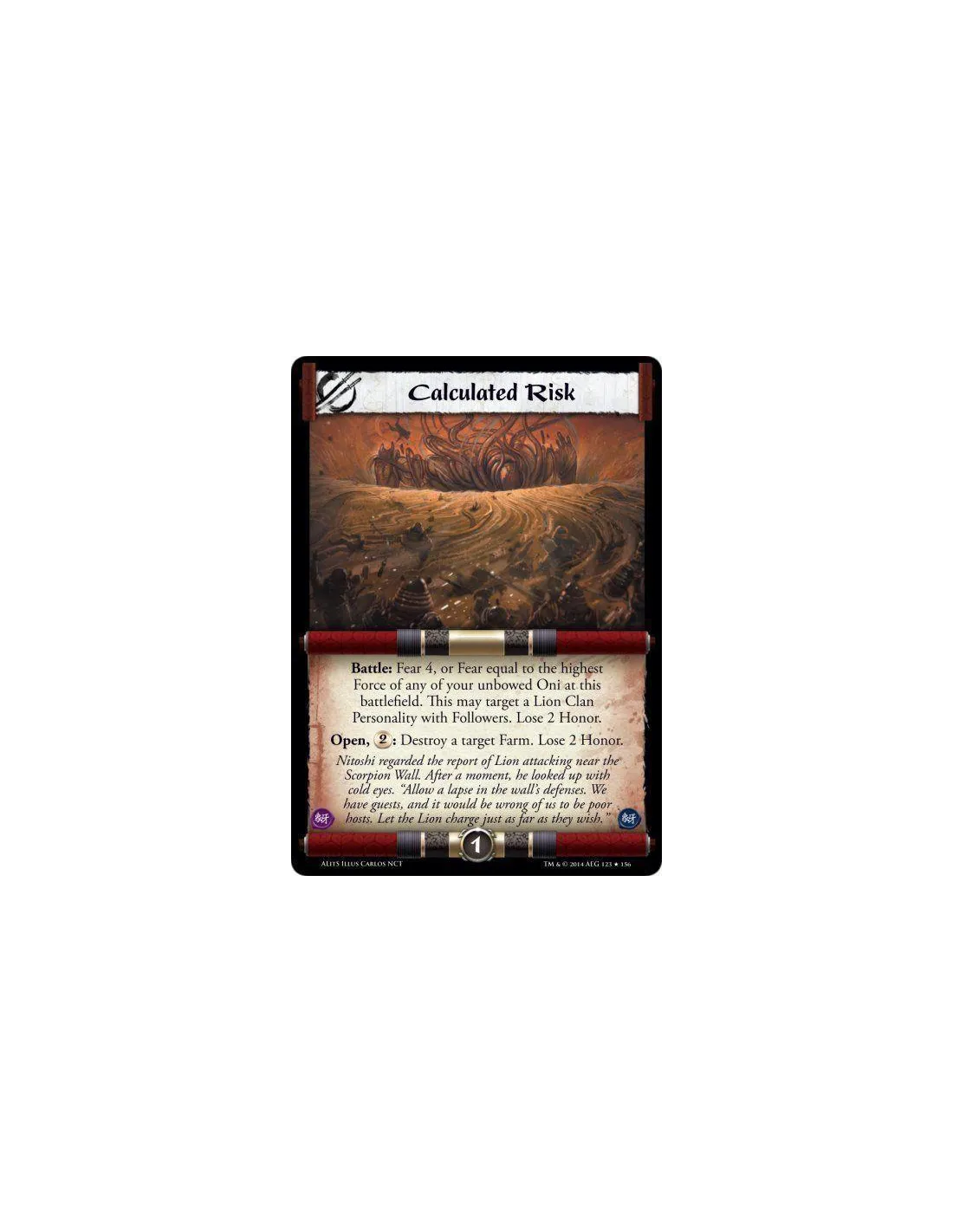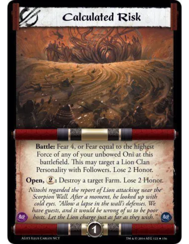 Battle: Fear 4, or Fear equal to the highest Force of any of your unbowed Oni at this battlefield. This may target a Lion Clan Personality with Followers. Lose 2 Honor.