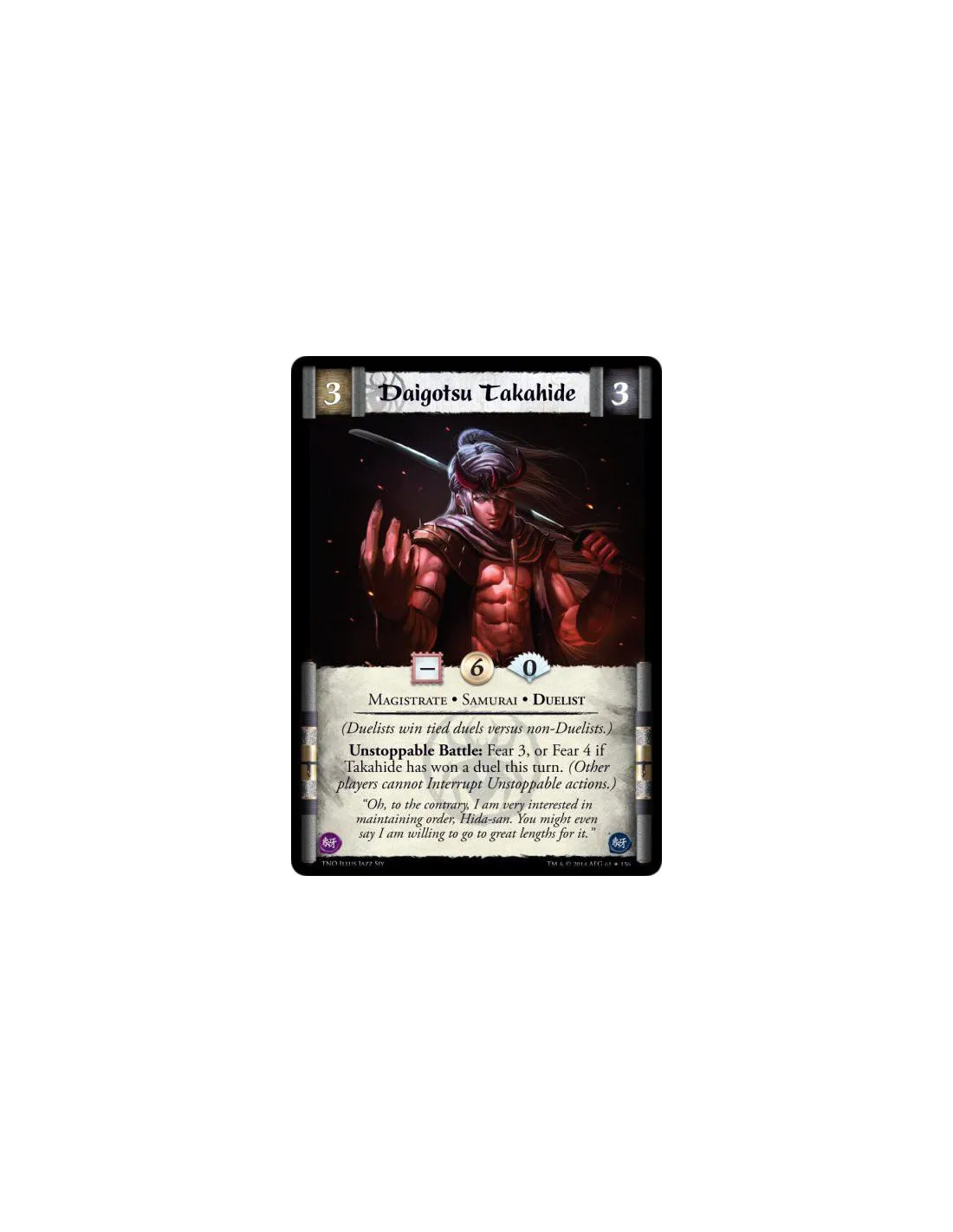 Unstoppable Battle: Fear 3, or Fear 4 if Takahide has won a duel this turn. (Other players cannot Interrupt Unstoppable actions.)