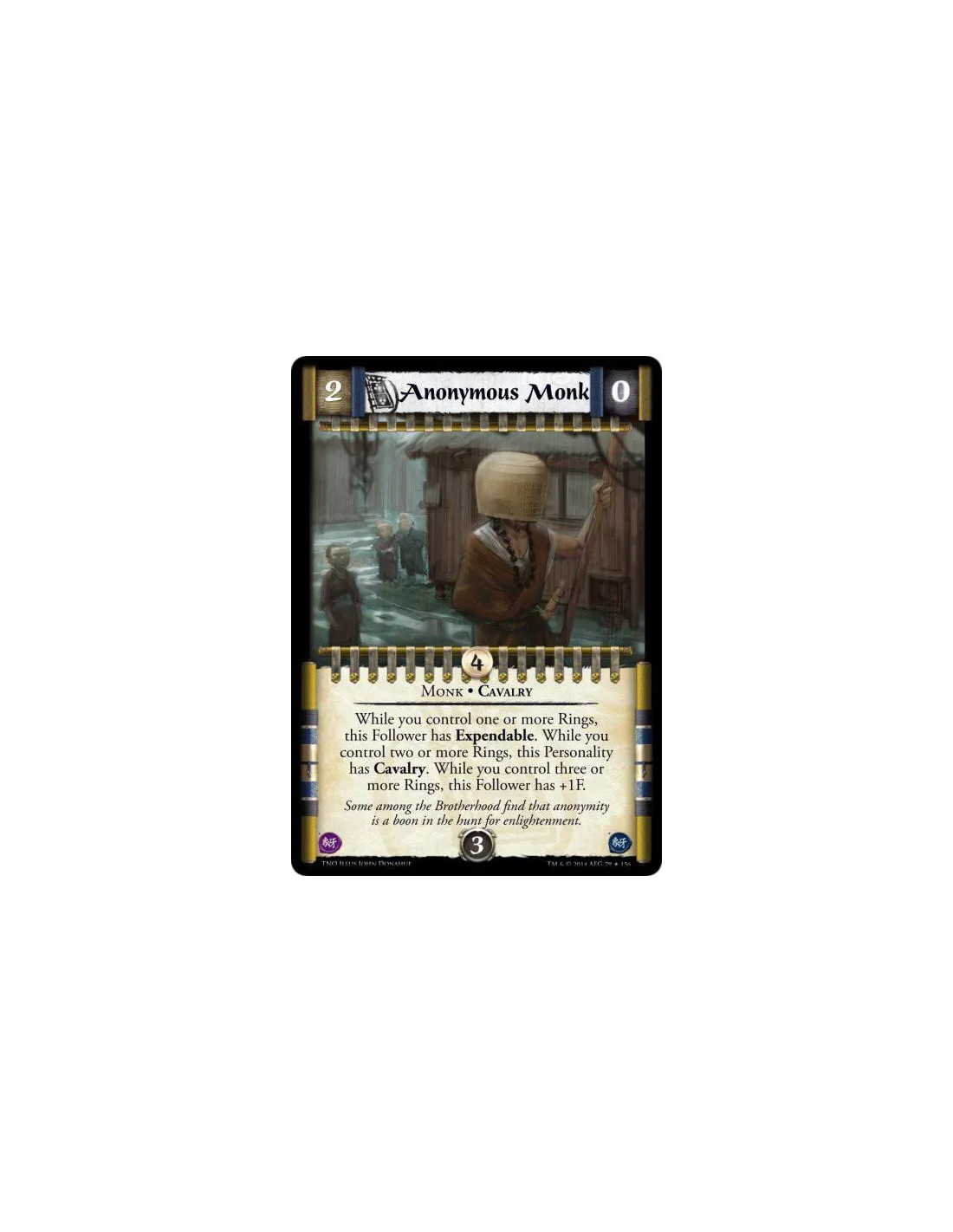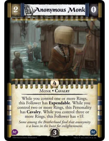While you control one or more Rings, this Follower has Expendable. While you control two or more Rings, this Personality has Cavalry. While you control three or more Rings, this Follower has +1F.