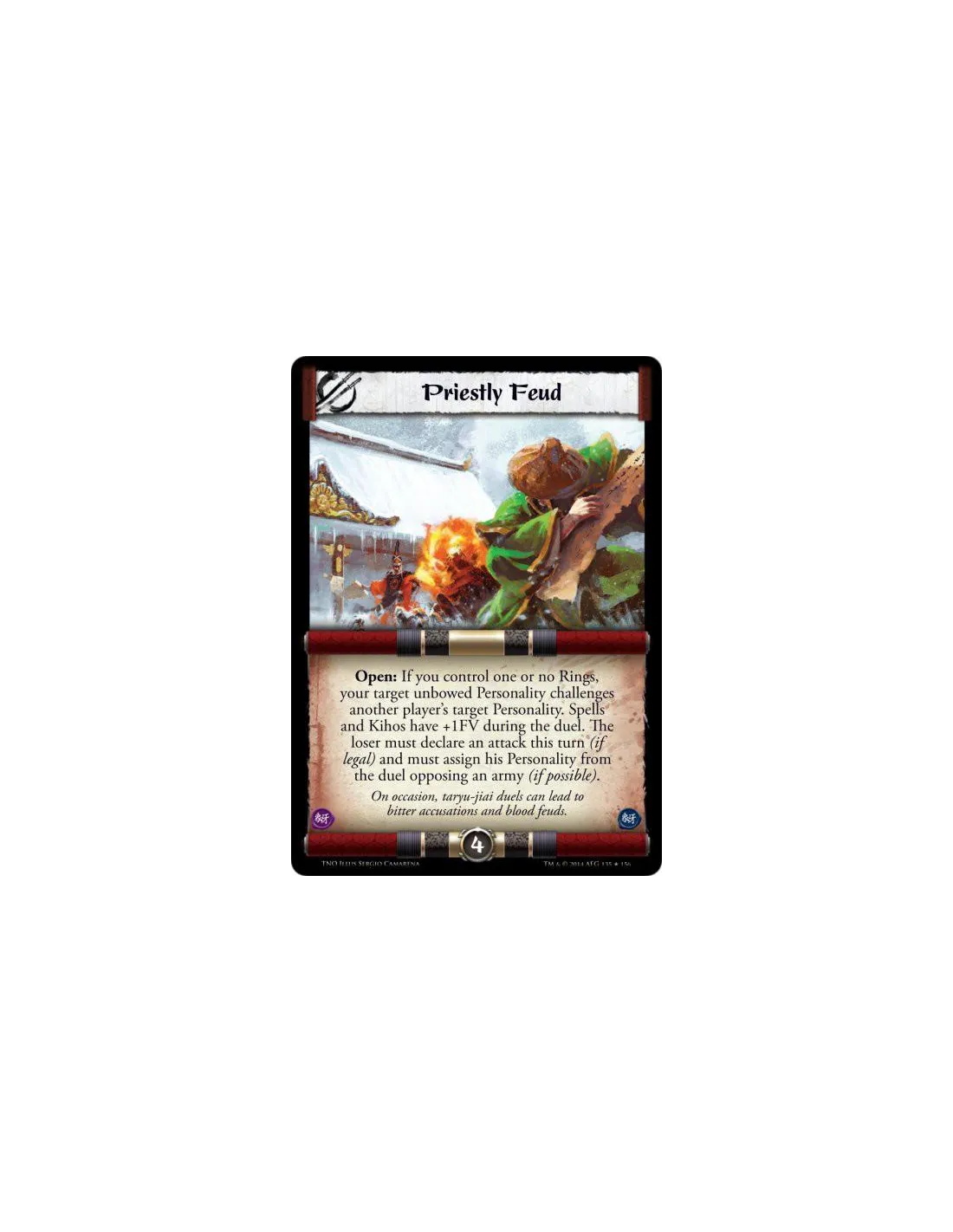Open: If you control one or no Rings, your target unbowed Personality challenges another player's target Personality. Spells and Kihos have +1FV during the duel. The loser must declare an attack this turn (if legal) and must assign his Personality from the duel opposing an army (if possible).