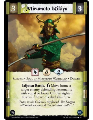 Iaijutsu Battle, w: Move home a target enemy defending Personality with equal or lower Chi. Straighten Rikiya if he won a duel this turn.