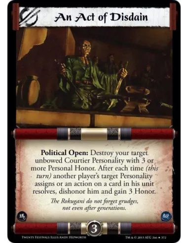 Political Open: Destroy your target unbowed Courtier Personality with 3 or more Personal Honor. After each time (this turn) another player's target Personality assigns or an action on a card in his unit resolves, dishonor him and gain 3 Honor.
