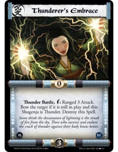 Thunder Battle, w: Ranged 3 Attack. Bow the target if it is still in play and this Shugenja is Thunder. Destroy this Spell.
