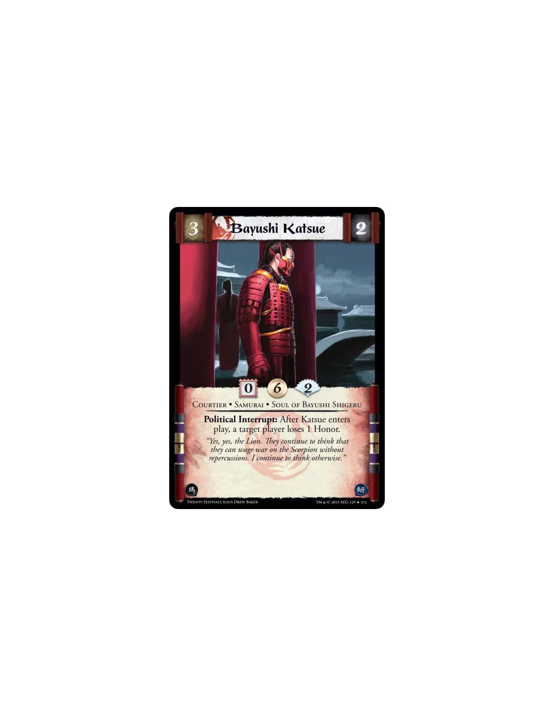 Political Interrupt: After Katsue enters play, a target player loses 1 Honor.
