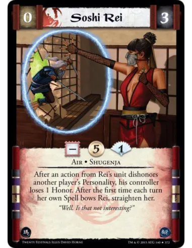 After an action from Rei's unit dishonors another player's Personality, his controller loses 1 Honor. After the first time each turn her own Spell bows Rei, straighten her.