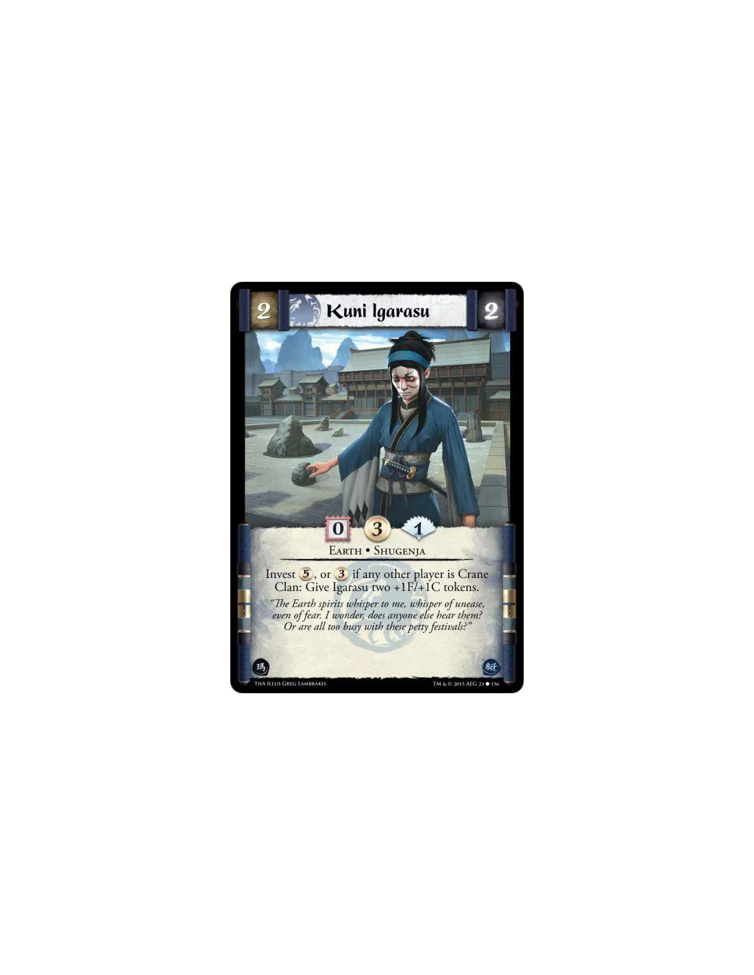 Invest 5, or 3 if any other player is Crane Clan: Give Igarasu two +1F/+1C tokens.