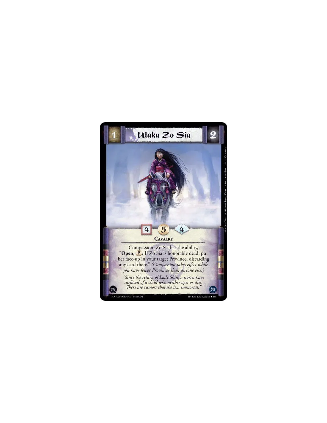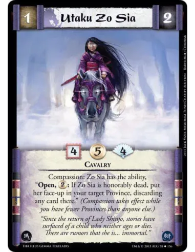 Compassion: Zo Sia has the ability, "Open, : If Zo Sia is honorably dead, put her face-up in your target Province, discarding any card there." (Compassion takes effect while you have fewer Provinces than anyone else.)