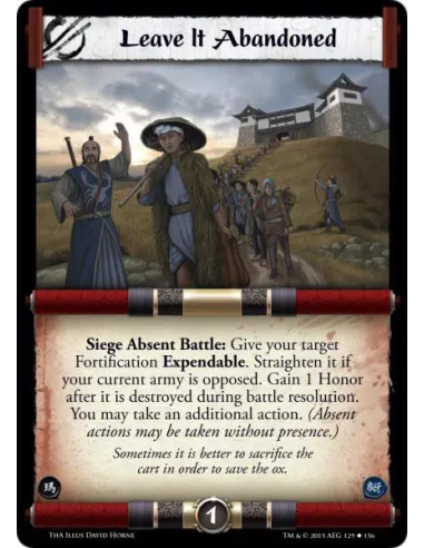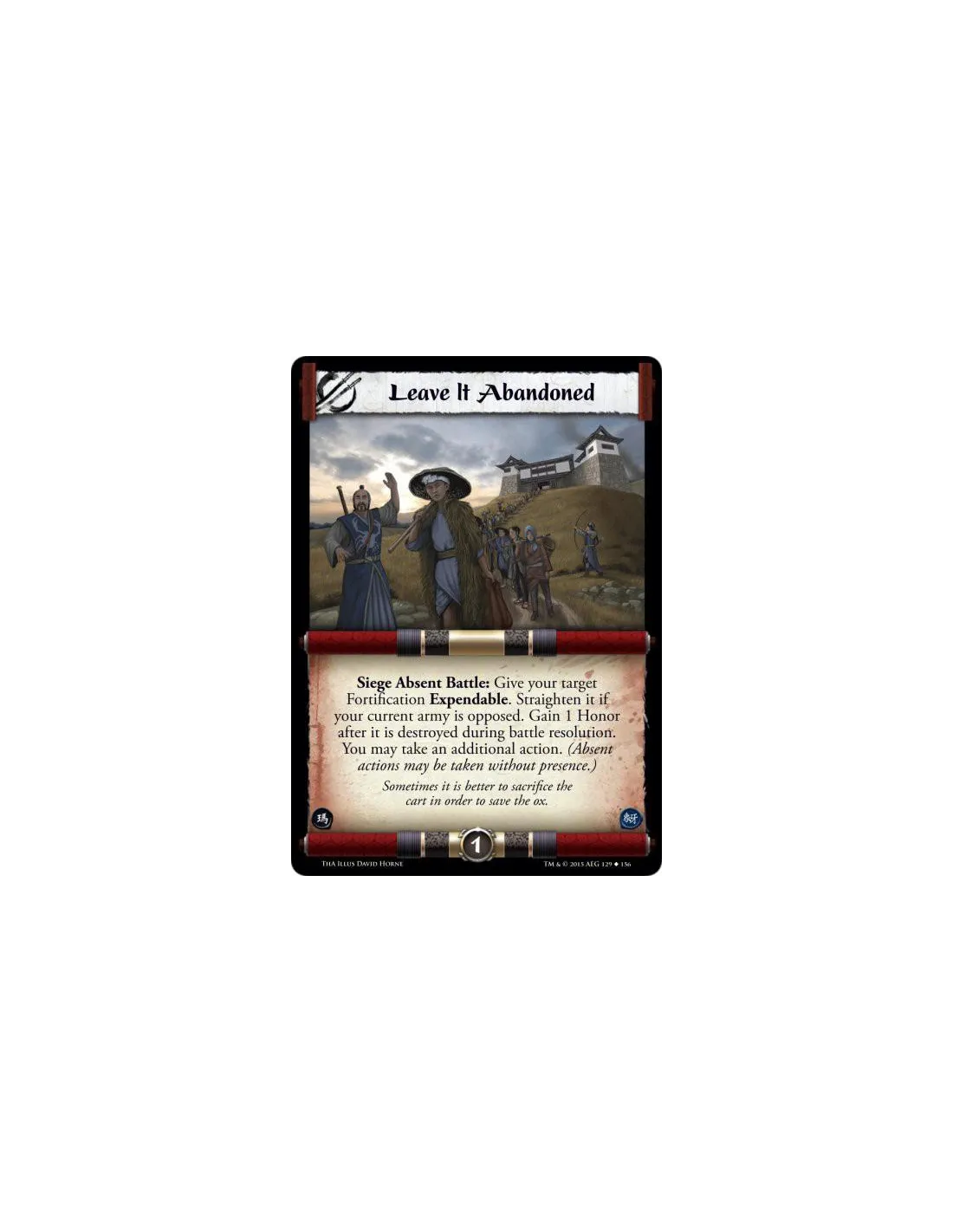 Siege Absent Battle: Give your target Fortification Expendable. Straighten it if your current army is opposed. Gain 1 Honor after it is destroyed during battle resolution. You may take an additional action. (Absent actions may be taken without presence.)
