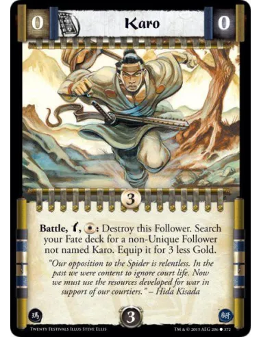 IfBattle, w, *:: Destroy this Follower. Search your Fate deck for a non-Unique Follower not named Karo. Equip it for 3 less Gold.