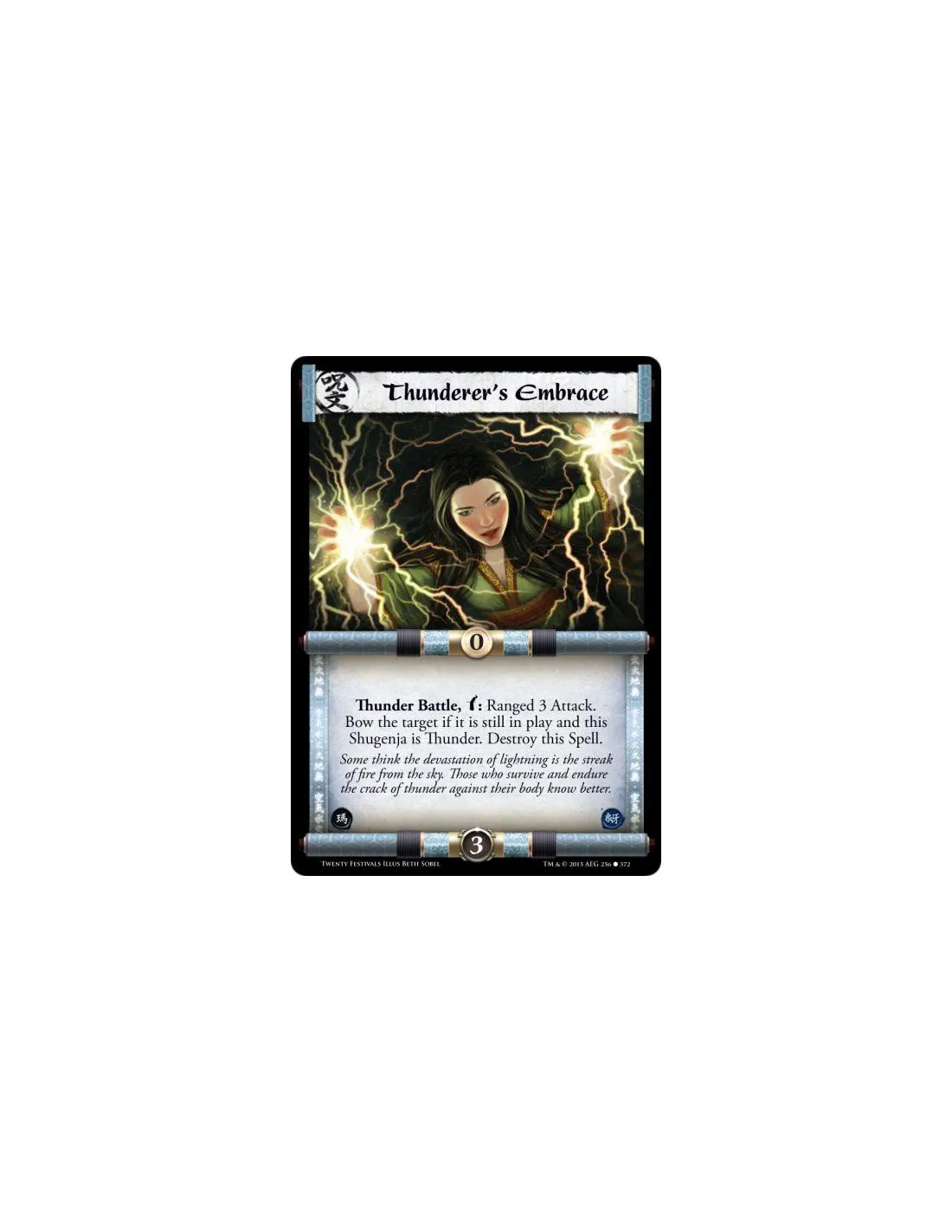 Thunder Battle, w: Ranged 3 Attack. Bow the target if it is still in play and this Shugenja is Thunder. Destroy this Spell.