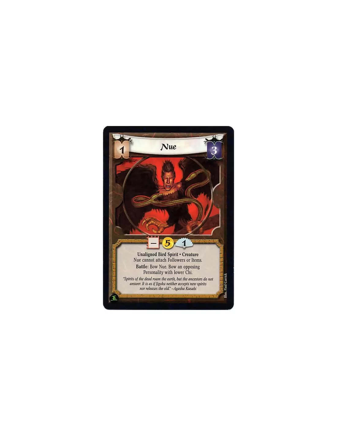 Unaligned Bird Spirit. Creature Nue cannot attach Followers or Items. Battle: Bow Nue. Bow an opposing Personality with lower Chi.