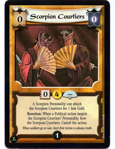 A Scorpion Personality can attach the Scorpion Courtiers for 1 less Gold. Reaction: When a Political action targest the Scorpion Courtiers' Personality, bow the Scorpion Courtiers. Cancel the action.