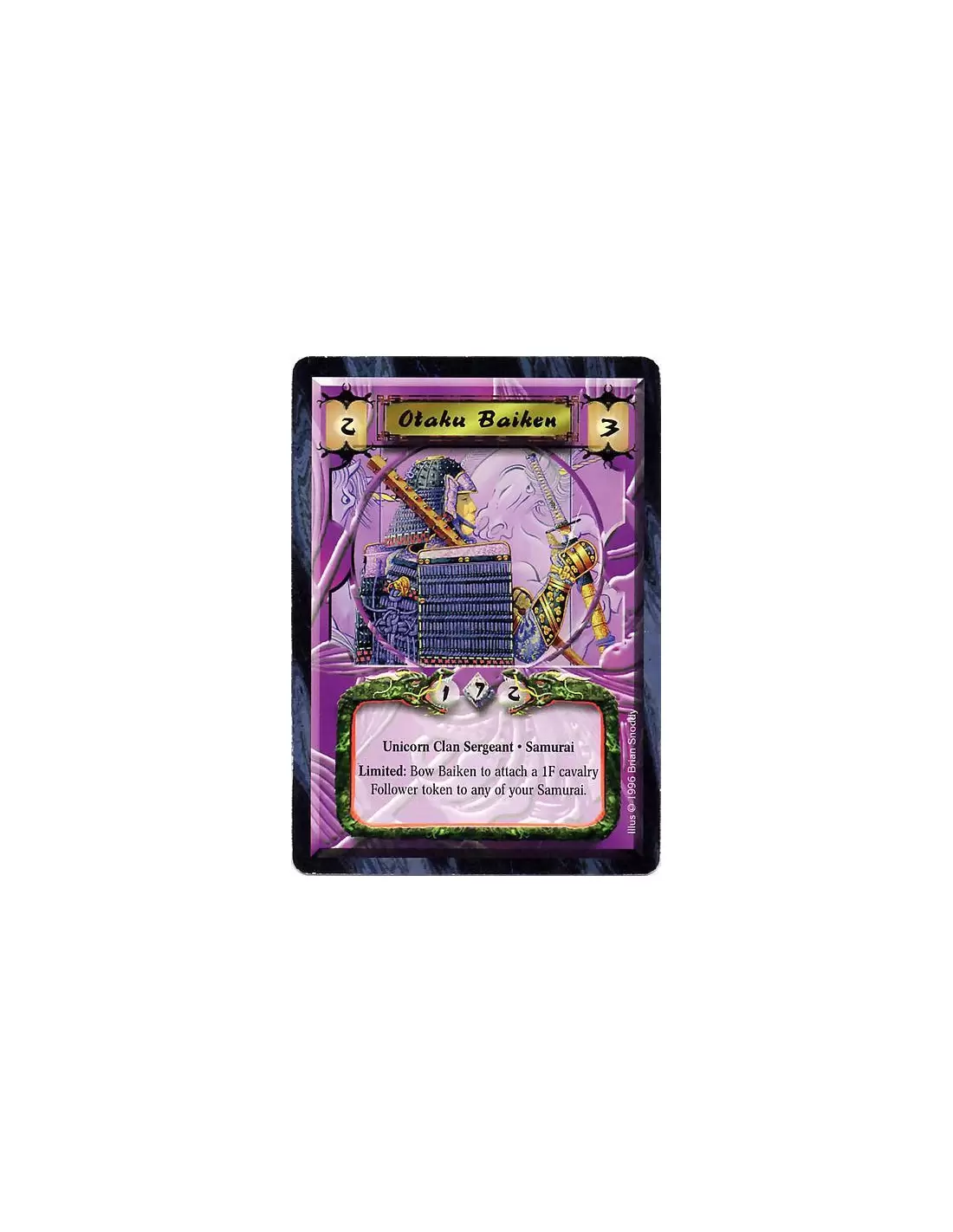 Unicorn Clan Sergeant. Samurai Limited: Bow Baiken to attach a 1F cavalry Follower token to any of your Samurai.