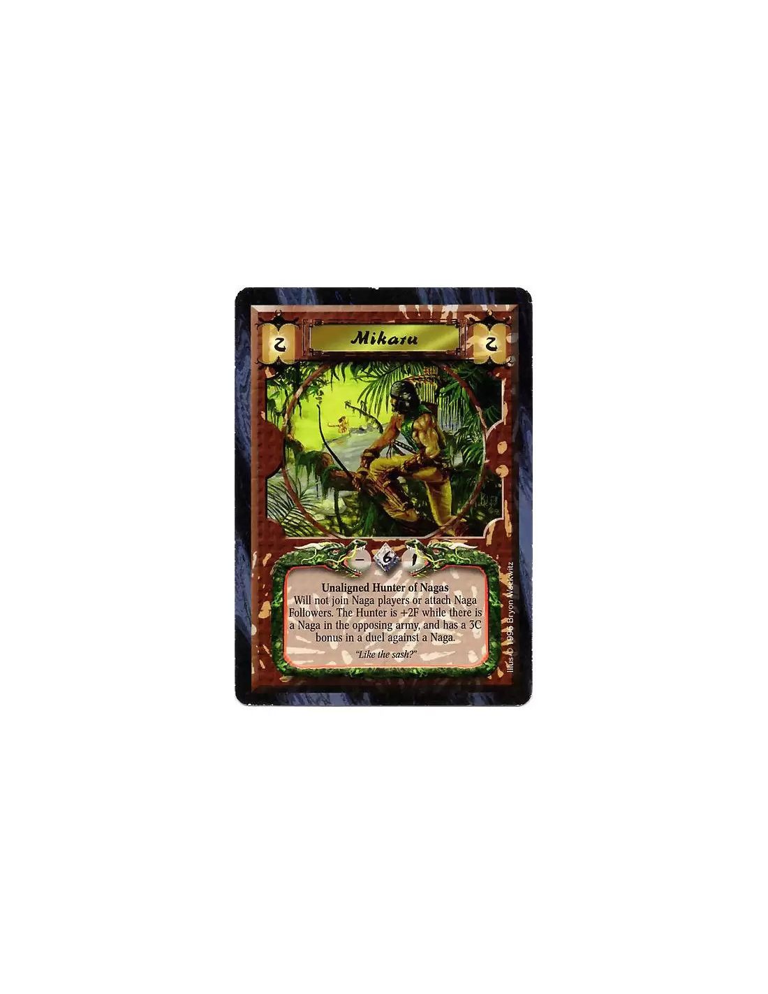 Unaligned Hunter of Nagas Will not join Naga players or attach Naga Followers. The Hunter is +2F while there is a Naga in the opposing army, and has a 3C bonus in a duel against a Naga. (Errata: Is not a Naga card himself.)