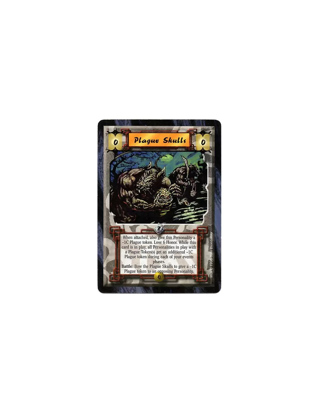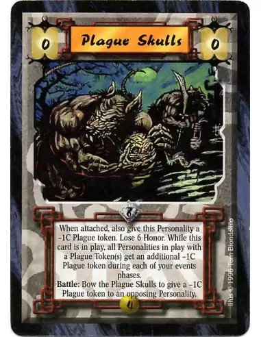 When attached, also give this Personality a -1C Plague token. Lose 6 Honor. While this card is in play, all Personalities in play with a Plague Token(s) get an additional -1C Plague token during each of your events phases. Battle: Bow the Plague Skulls to give a -1C Plague token to an opposing Personality.