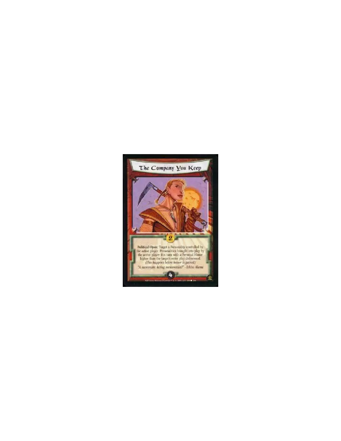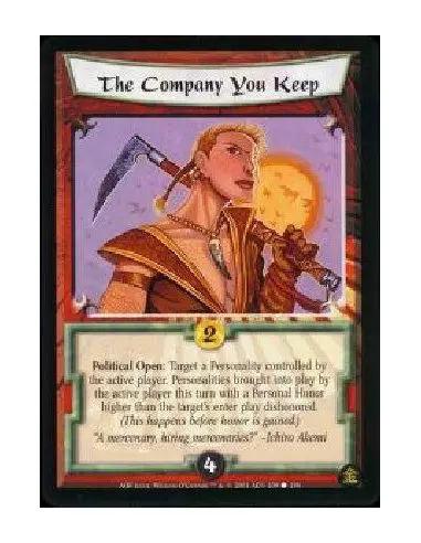 Political Open: Target a Personality controlled by the active player. Personalities brought into play by the active player this turn with a Personal Honor higher than the target's enter play dishonored. (This happens before honor is gained.)