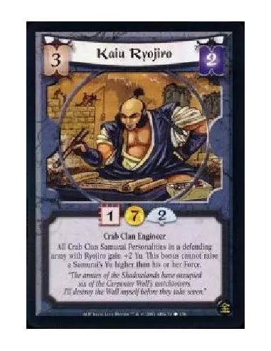 Crab Clan Engineer All Crab Clan Samurai Personalities in a deending army with Ryojiro gain +2 Yu. This bonus cannot raise a Samurai's Yu higher than his or her Force.