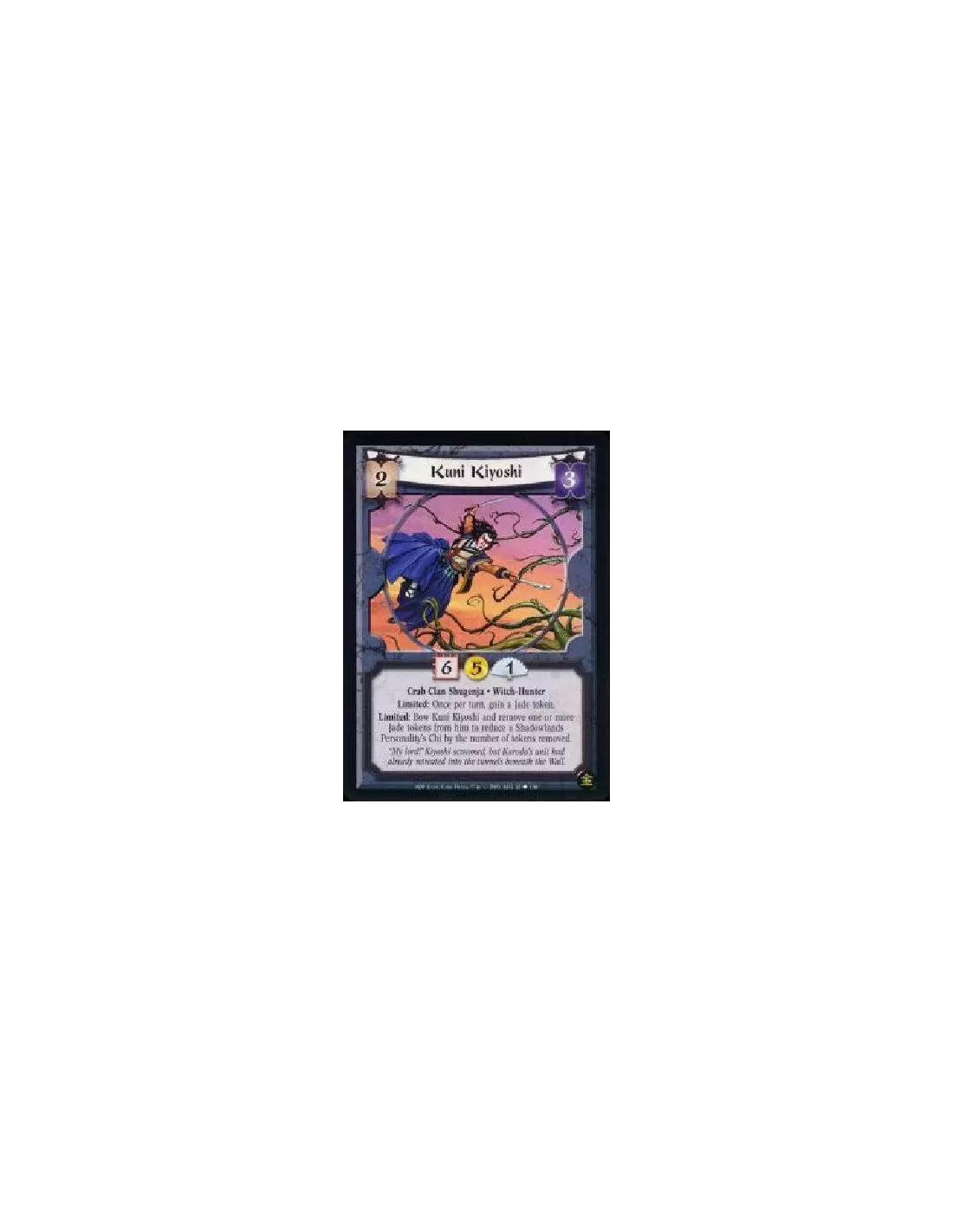 Crab Clan Shugenja * Witch-Hunter Limited: Once per turn, gain a Jade token. Limited: Bow Kuni Kiyoshi and remove one or more Jade tokens from him to reduce a Shadowlands Personality's Chi by the number of tokens removed.