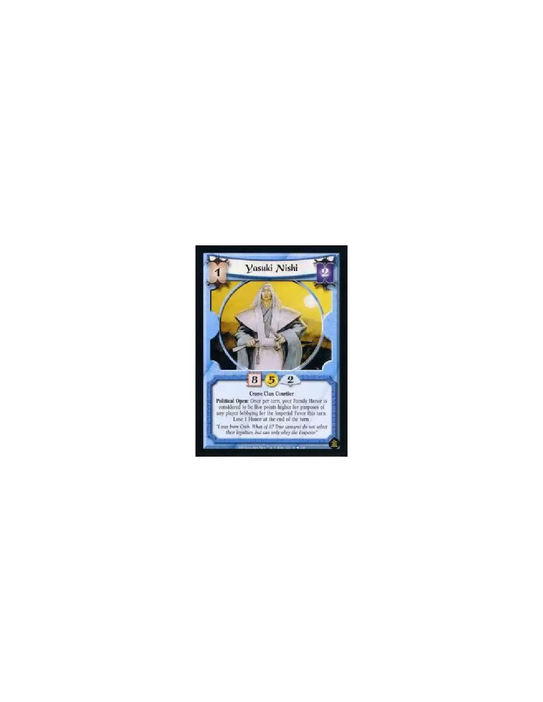 Crane Clan Courtier Political Open: Once per turn, your Family Honor is considered to be five points higher for purposes of any player lobbying for the Imperial Favor this turn. Lose 1 Honor at the end of the turn.