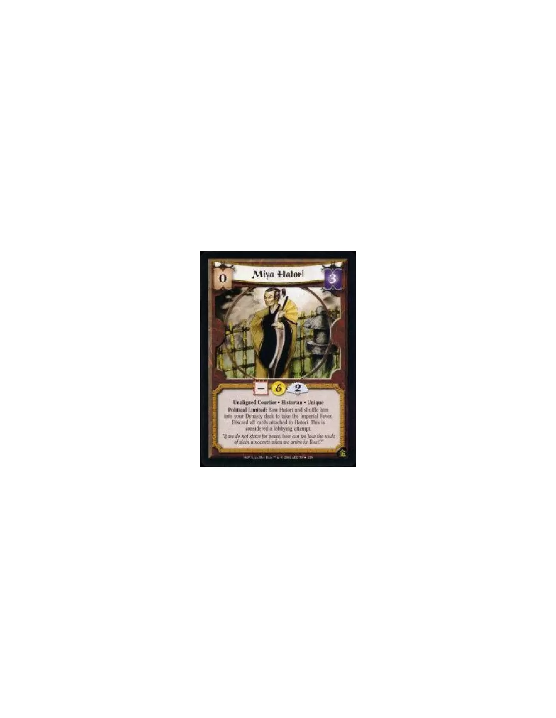 Unaligned Courtier * Historian * Unique Political Limited: Bow Hatori and shuffle him into your Dynasty deck to take the Imperial Favor. Discard all cards attached to Hatori. This is considered a lobbying attempt.