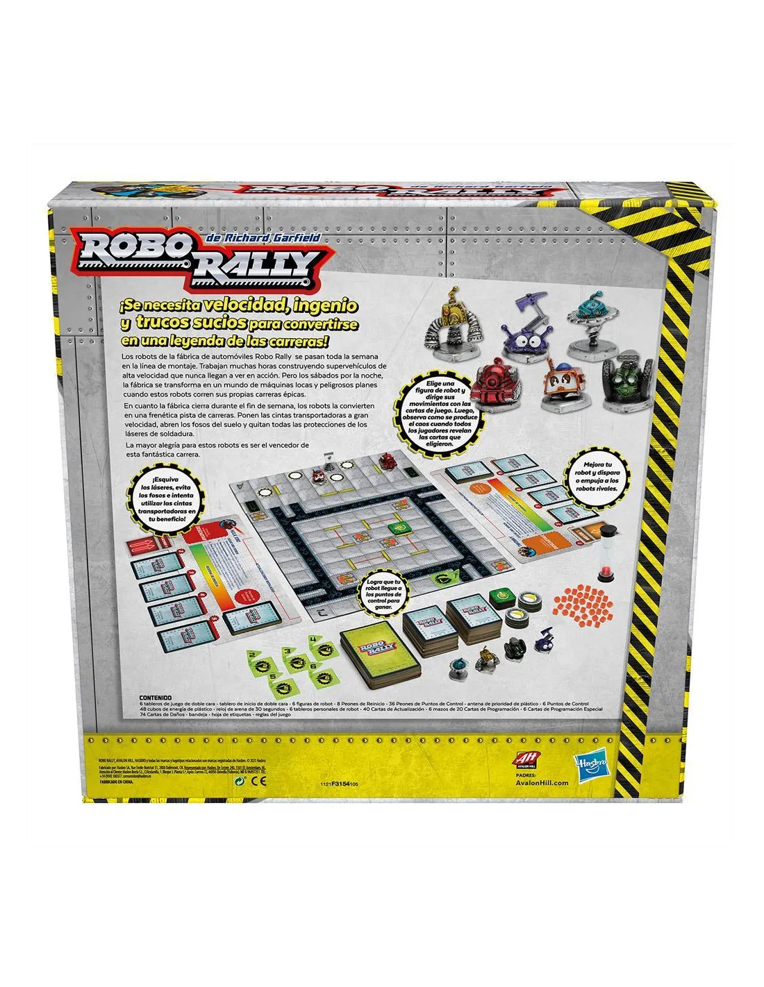 La carrera ha comenzado para los robots de la fábrica de automóviles Robo Rally que trabajan largos y duros días en la línea de montaje construyendo superdeportivos de alta velocidad, pero nunca llegan a verlos en acción. Los sábados por la noche, la fábrica cobra vida como la pista de carreras definitiva con traicioneros obstáculos y sabotaje de los rivales. En Robo Rally, los jugadores mueven sus robots a través del recorrido acelerando a través de corredores y esquivando trampas para llegar primero a cada punto de control. Solo sobreviven los robots más fuertes! Entra en el mundo de las máquinas locas y los esquemas peligrosos en el juego de mesa Robo Rally. Los jugadores controlan su robot con tarjetas de juego que revelan instrucciones sobre cómo los robots pueden moverse a través de la agitada fábrica de automóviles Robo Rally. Usa la estrategia para burlar a los robots rivales mientras corres hacia cada punto de control en el curso elegido en orden numérico. Tenga cuidado con los obstáculos de la fábrica, como láseres industriales, pozos abiertos y cintas transportadoras en movimiento que pueden hacer o deshacer la carrera. A partir de 12 años. 20 - 120 minutos aprox. De 2 a 6 jugadores