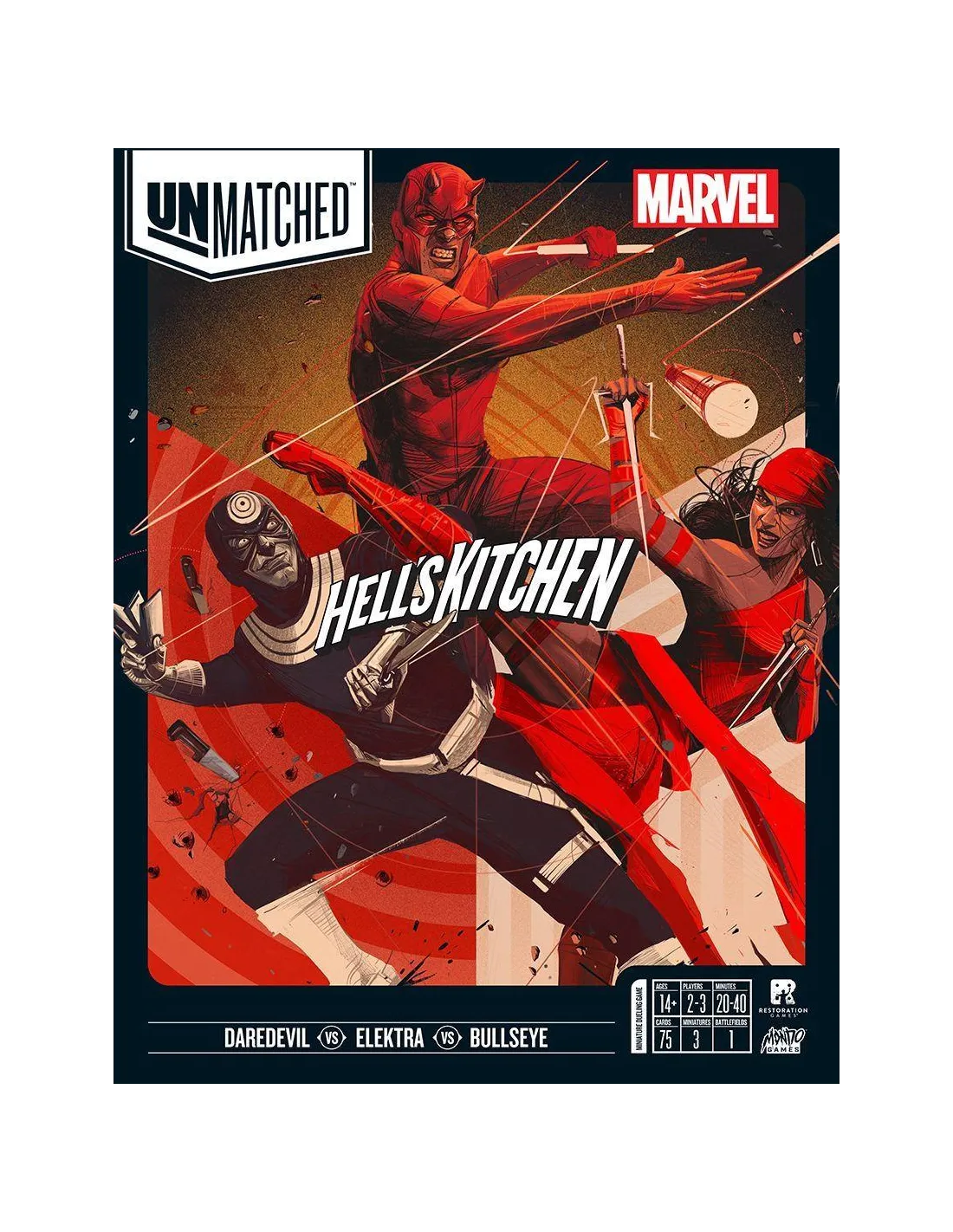 Unmatched Hell's Kitchen te plantea tomar el control de uno de estos tres superhéroe de Marvel dentro del universo de los combates imposibles de Unmatched: Daredevil, Elektra y Bullseye.