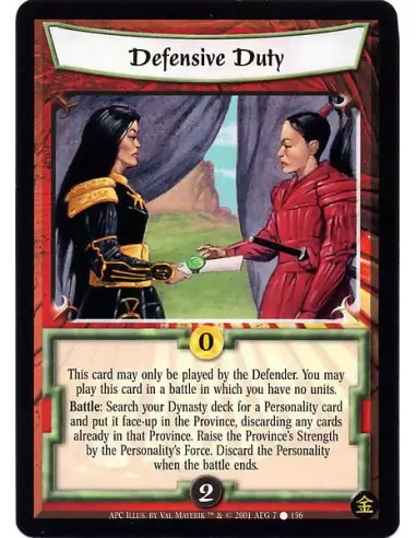 This cards may only be played by the Defender. You may play this card in a battle in which you have no units. Battle : Search your Dynasty deck for a Personality card and put it face up in the Province, discarding any cards already in that Province. Raise the Province's Strength by the Personality's Force. Discard the Personality when the battle ends.