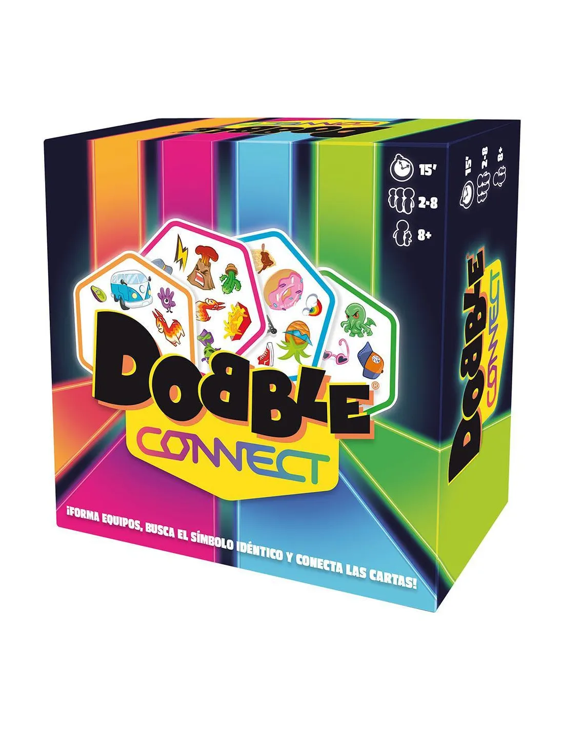 Dobble Connect contiene 90 cartas con 10 símbolos en cada una y más de 91 símbolos en total. Solamente hay 1 símbolo idéntico entre cada 2 cartas. ¡A buscar!