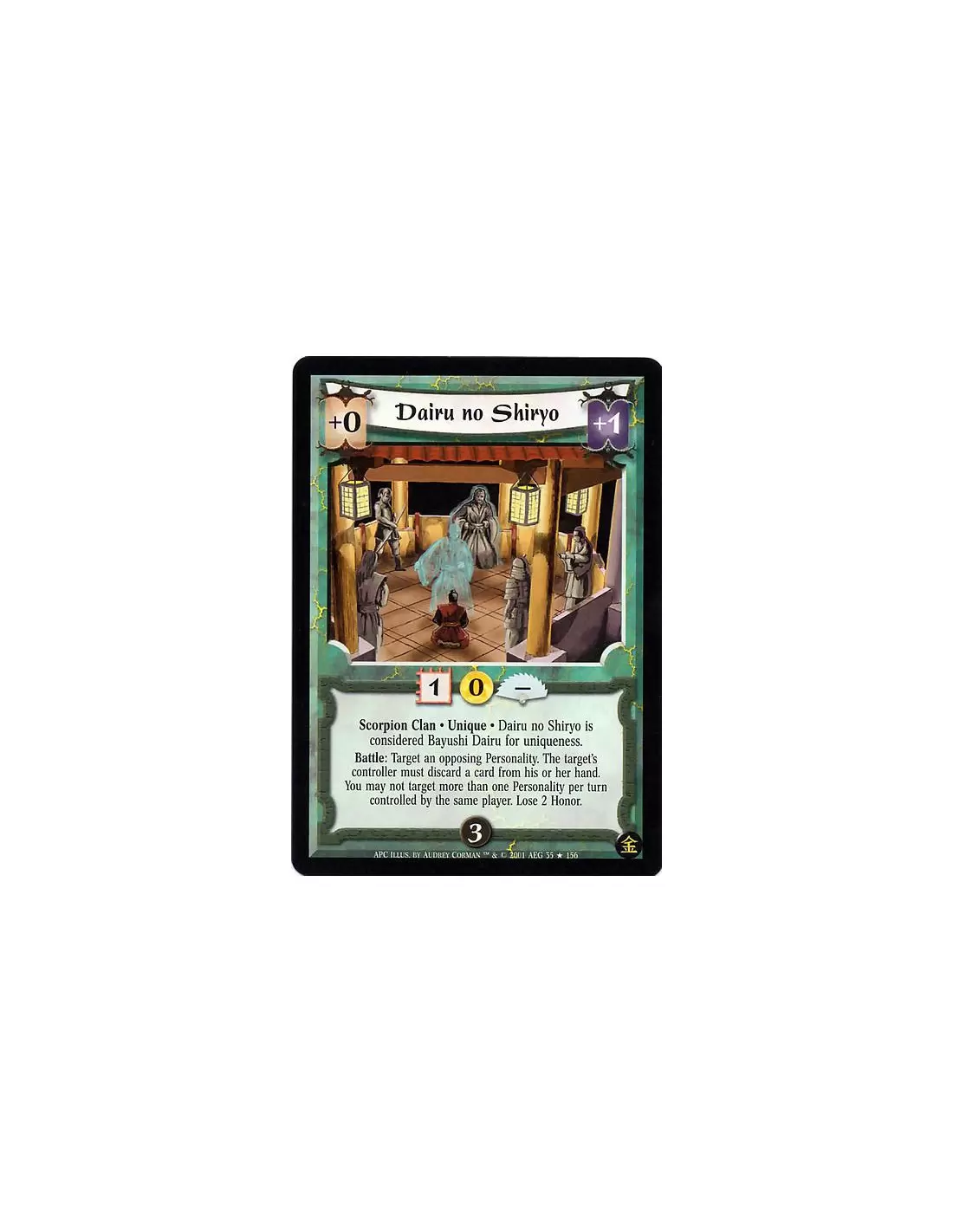 Scorpion Clan. Unique Dairu no Shiryo is considered Bayushi Dairu for uniqueness. Battle: Target an opposing Personality. The target's controller must discard a card from his or her hand. You may not target more then one Personality per turn controlled by the same player. Lose 2 honor