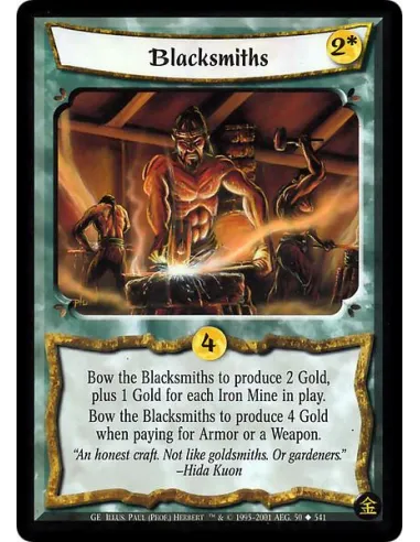 Bow Blacksmiths to produce 2 Gold, plus 1 Gold for every Iron Mine in play. Bow Blacksmiths to produce 4 Gold when paying for a Weapon or Armor.