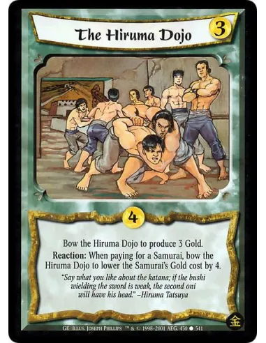 Bow the Hiruma Dojo to produce 3 Gold. Reaction: When paying for a Samurai, bow the Hiruma Dojo to lower that Samurai's Gold cost by 4.