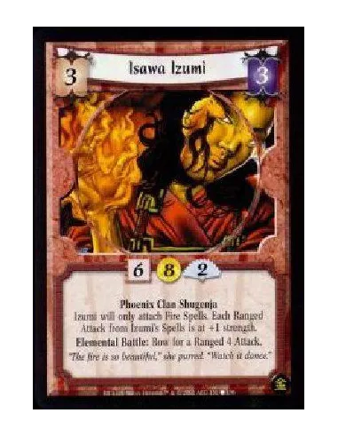 Phoenix Clan Shugenja Izumi will only attach Fire Spells. Each Ranged Attack from Izumi's Spells is at +1 strength. Elemental Battle: Bow for a Ranged 4 Attack.