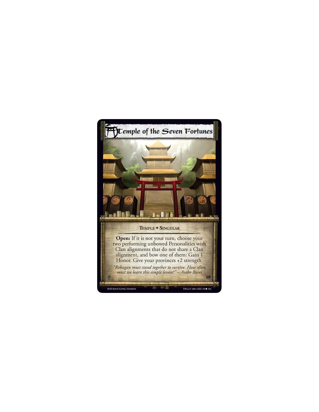 Open: If it is not your turn, choose your two unbowed performing Personalities with Clan alignments that do not share a Clan alignment, and bow one of them: Gain 1 Honor. Give your provinces +2 strength.