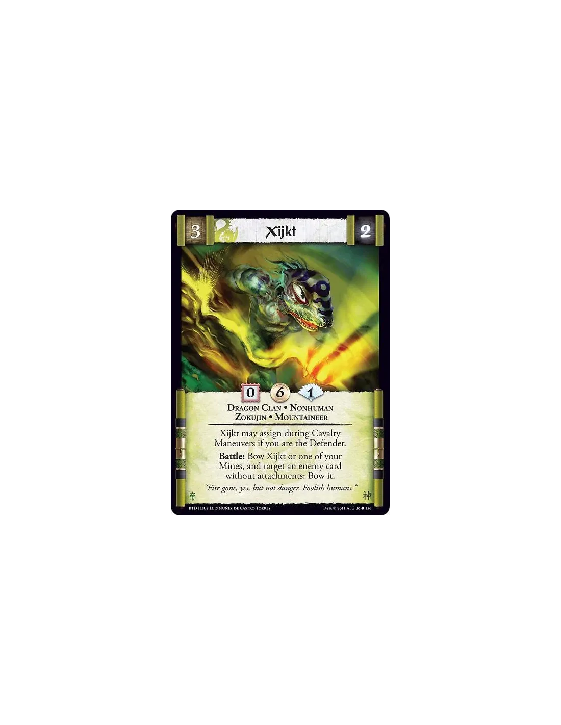 Xijkt may assign during Cavalry Maneuvers if you are the Defender. Battle: Bow Xijkt or one of your Mines, and target an enemy card without attachments: Bow it.