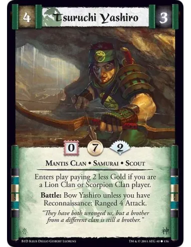 Enters play paying 2 less Gold if you are a Lion Clan or Scorpion Clan player. Battle: Bow Yashiro unless you have Reconnaissance: Ranged 4 Attack.