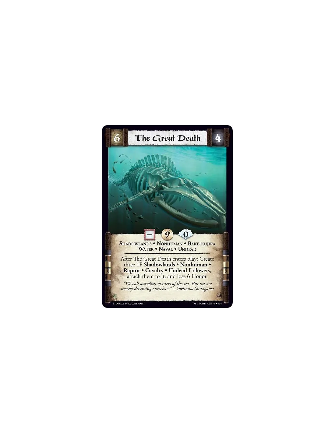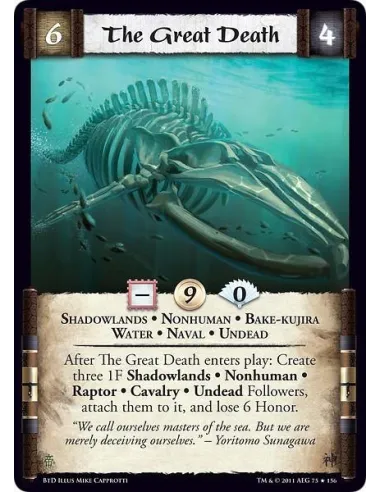 After The Great Death enters play: Create three 1F Shadowlands • Nonhuman • Raptor • Cavalry • Undead Followers, attach them to it, and lose 6 Honor.