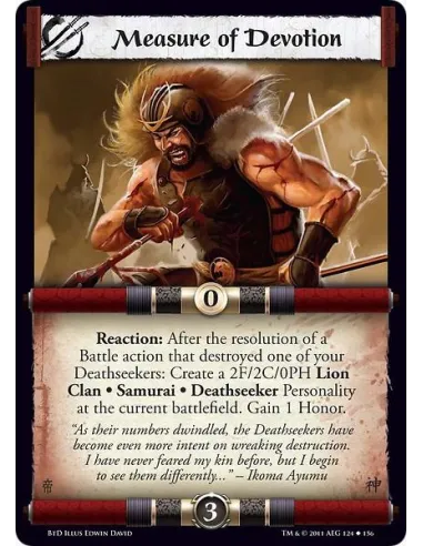 Reaction: After the resolution of a Battle action that destroyed one of your Deathseekers: Create a 2F/2C/0PH Lion Clan • Samurai • Deathseeker Personality at the current battlefield. Gain 1 Honor.