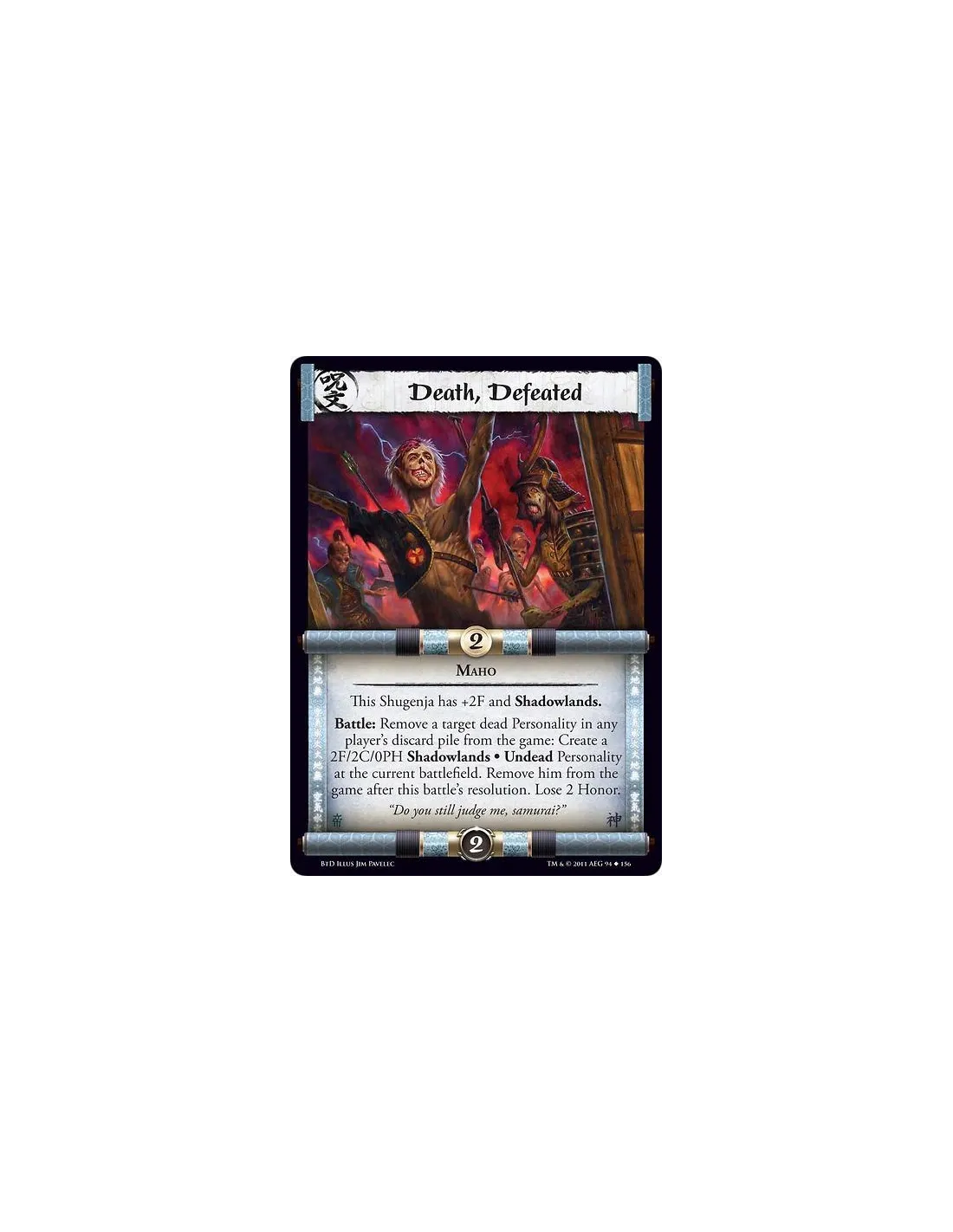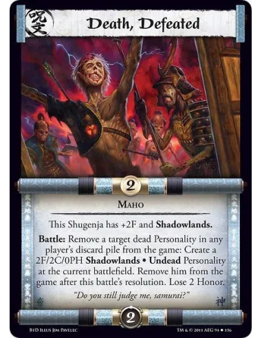 This Shugenja has +2F and Shadowlands. Battle: Remove a target dead Personality in any player’s discard pile from the game: Create a 2F/2C/0PH Shadowlands • Undead Personality at the current battlefield. Remove him from the game after this battle’s resolution. Lose 2 Honor.