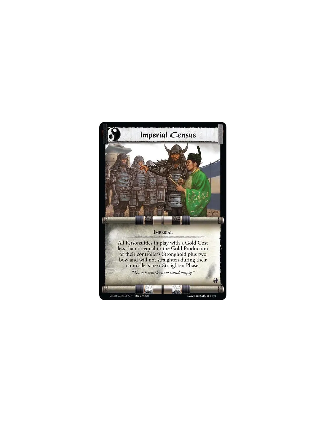 Imperial If you control no Ninja or Shadowlands cards, all Personalities in play with a Gold Cost less than or equal to the Gold Production of their controller’s Stronghold plus two bow and will not straighten during their controller’s next Straighten Phase.