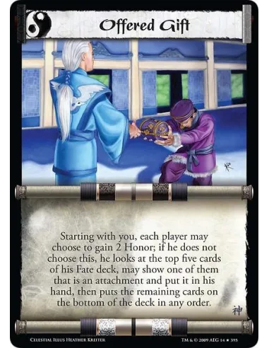 Starting with you, each player may choose to gain 2 Honor; if he does not choose this, he looks at the top five cards of his Fate deck, may show one of them that is an attachment and put it in his hand, then puts the remaining cards on the bottom of the deck in any order.