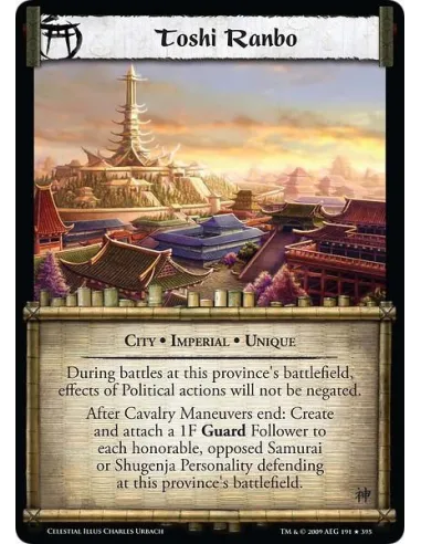 City • Imperial • Unique During battles at this province's battlefield, effects of Political actions will not be negated. After Cavalry Maneuvers end: Create and attach a 1F Guard Follower to each honorable, opposed Samurai or Shugenja Personality defending at this province's battlefield.