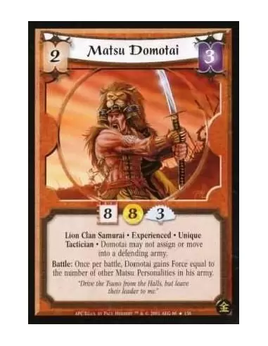 Lion Clan Samurai. Experienced. Unique. Tactician Domotai may not assign or move into a defending army. Battle : Once per battle, Domotai gains Force equal to the number of other Matsu Personalities in his army.