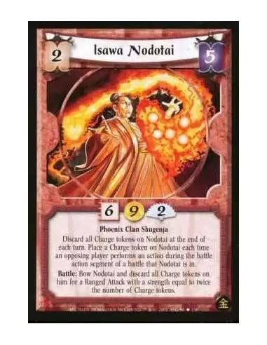 Phoenix Clan Shugenja Discard all Charge tokens on Nodotai at the end of each turn. Place a Charge token on Nodotai each time an opposing player performs an action during the battle action segment of a battle that Nodotai is in. Battle: Bow Nodotai and discard all Charge tokens on him for a Ranged Attack with a strength equal to twice the number of charge tokens.