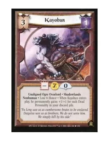 Unaligned Ogre Overlord. Shadowlands. Nonhuman Lose 6 Honor. When Kayobun enters play, he permanently gains +1/+1 for each Dead Personality in your discard pile.