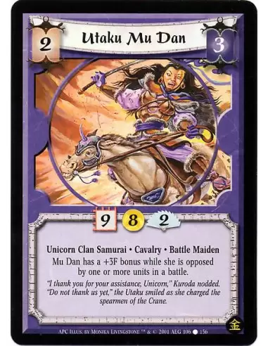 Unicorn Clan Samurai. Cavalry. Battle Maiden Mu Dan has a +3F while she is opposed by one or more units in a battle.