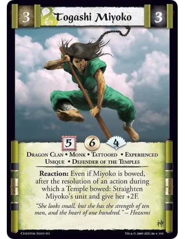 Dragon Clan • Monk • Tattooed • Experienced • Unique • Defender of the Temples Reaction: Even if Miyoko is bowed, after the resolution of an action during which a Temple bowed: Straighten Miyoko's unit and give her +2F.