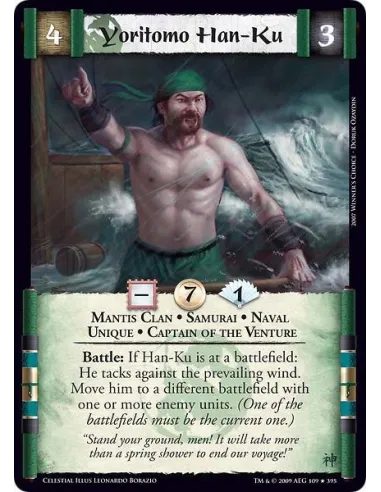 Mantis Clan • Samurai • Naval • Unique • Captain of the Venture Battle: If Han-Ku is at a battlefield: He tacks against the prevailing wind. Move him to a different battlefield with one or more enemy units. (One of the battlefields must be the current one.)